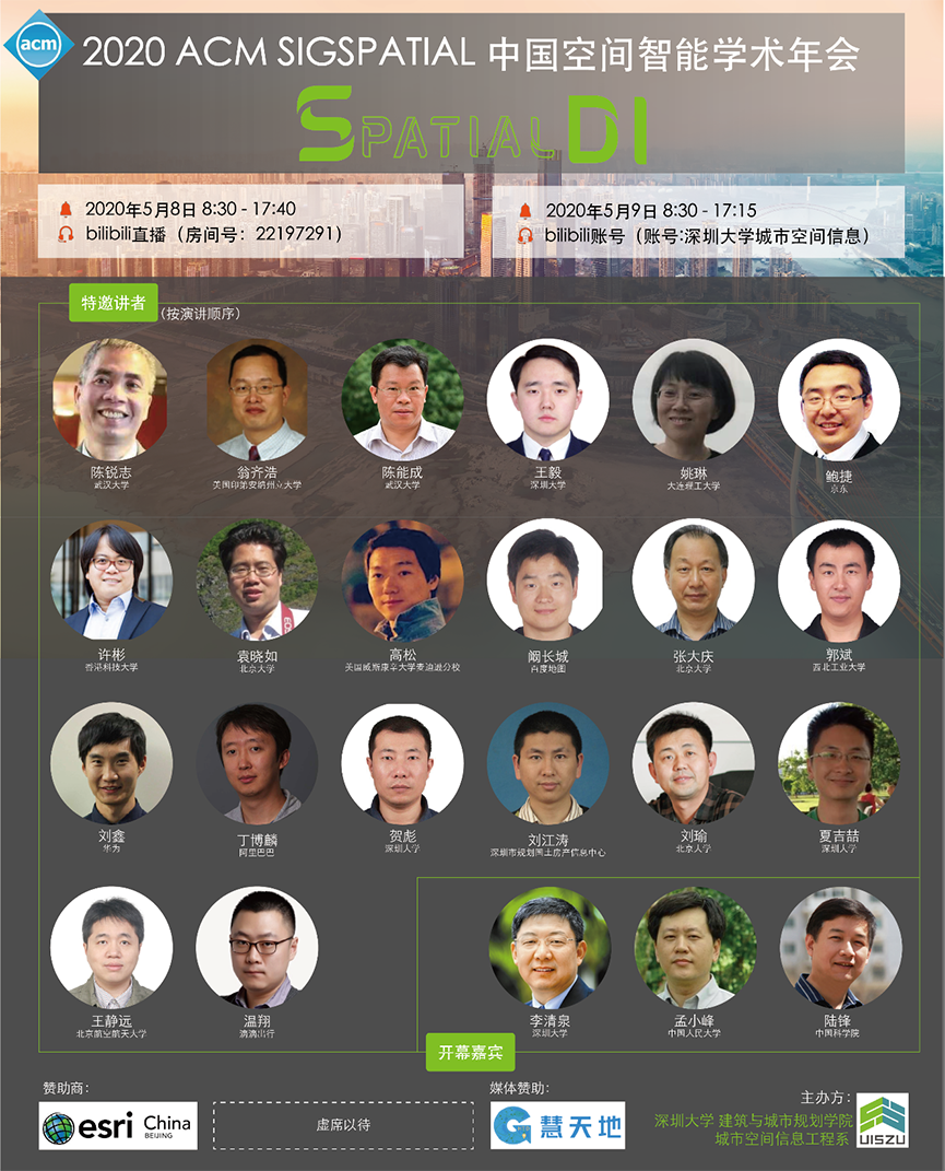 2020中国空间智能学术年会(SpatialDI 2020)由ACM SIGSPATIAL 中国分会主办,由深圳大学地理空间信息研究团队承办;由于新冠疫情的影响,原定于3月27-28日在深圳举行的会议将改为网络会议的方式进行。会议时间为2020年5月8 - 9日,其中8号为会议邀请嘉宾专题论坛,9号为会议接收论文报告专场(论文经程序委员会严格审稿筛选)。
